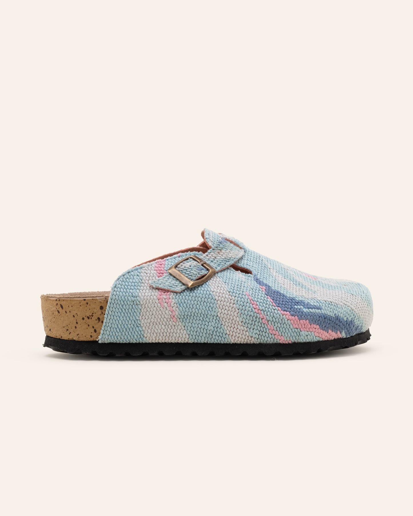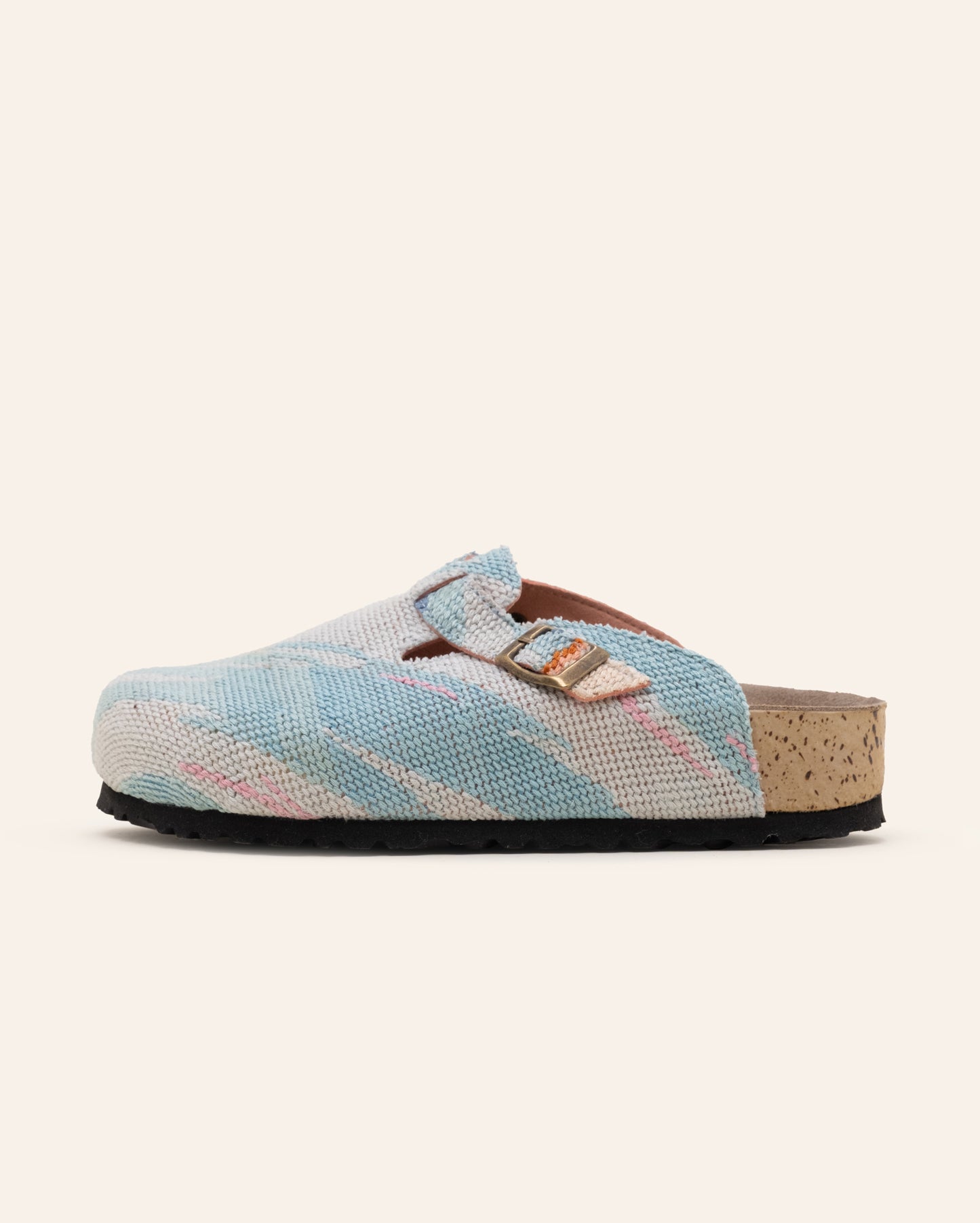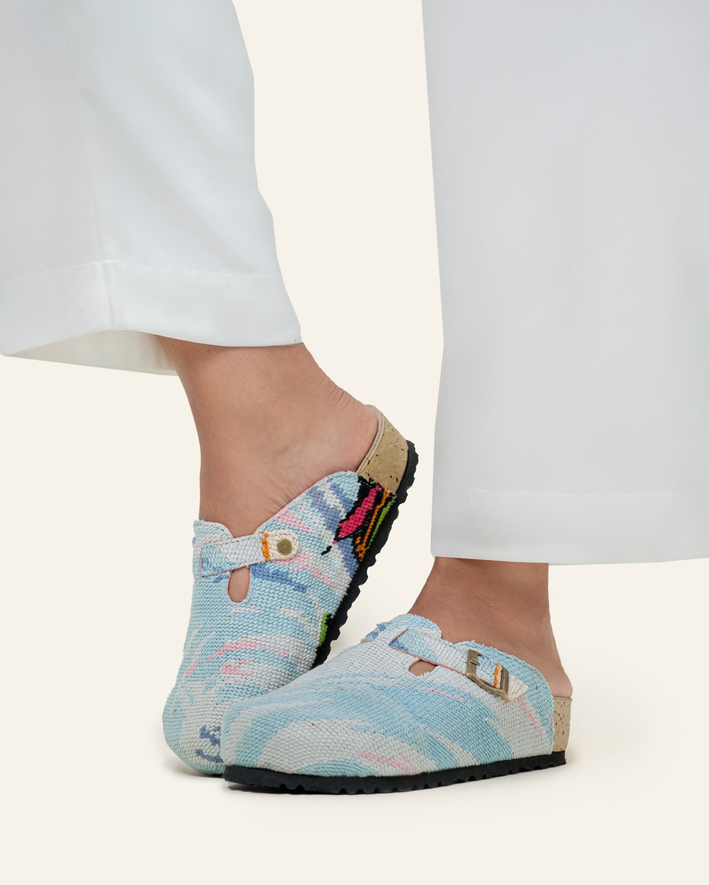 The upper of these sandals is made from hand-stitched Gobelin fabric, designed with an upcycling concept. The upper lining is made from micro-suede, and the insole lining is crafted from natural suede leather. The sole is made of PU/EVA material. Each pair is fully handmade and designed to support the natural ergonomic shape of the foot.