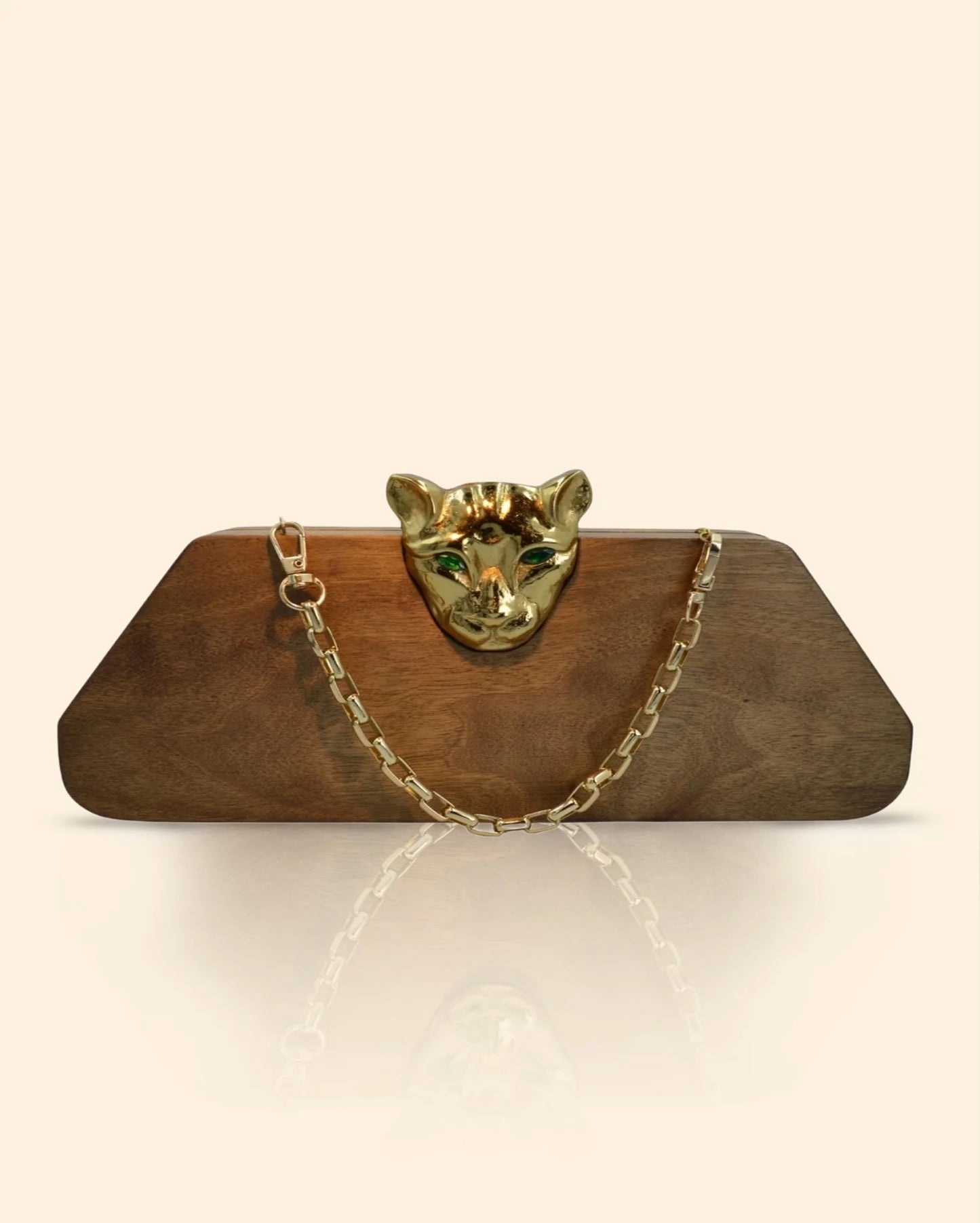 The Leopard Clutch is a sculptural expression of feminine power — crafted from rich walnut wood for a warm, organic texture. Drawing inspiration from the leopard’s blend of mystery and strength, its form exudes confidence and fluid elegance. A gold-plated brass clasp echoes the refined fierceness of a leopard’s silhouette, while crystal accents add a subtle sparkle. Each piece is handcrafted in small batches, making every clutch strikingly unique.