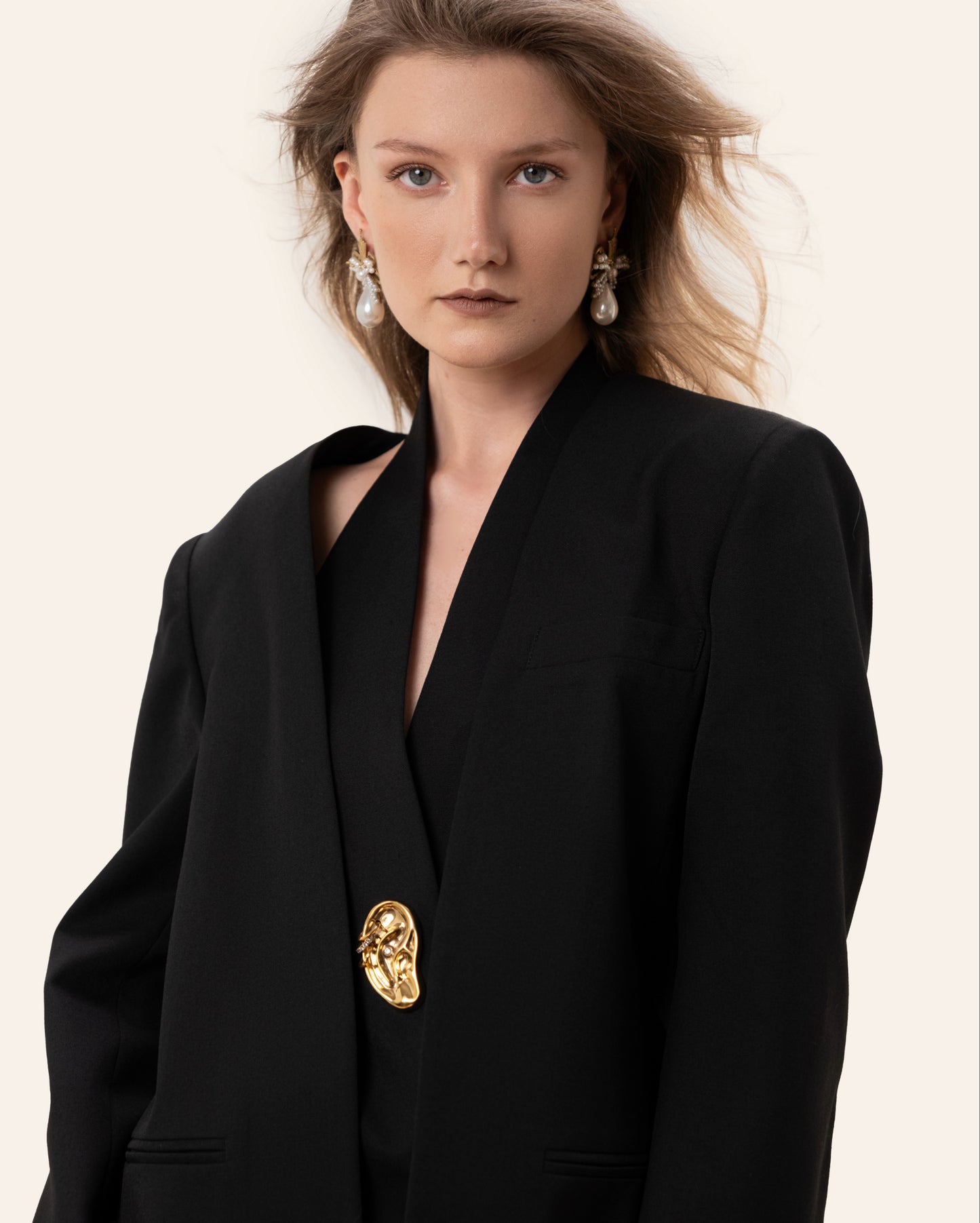 The Black Ava Blazer has a clean, structured shape with sharp shoulders and a relaxed length that feels modern and confident. The deep neckline and single gold detail add just enough edge, keeping it strong, minimal, and easy to style.