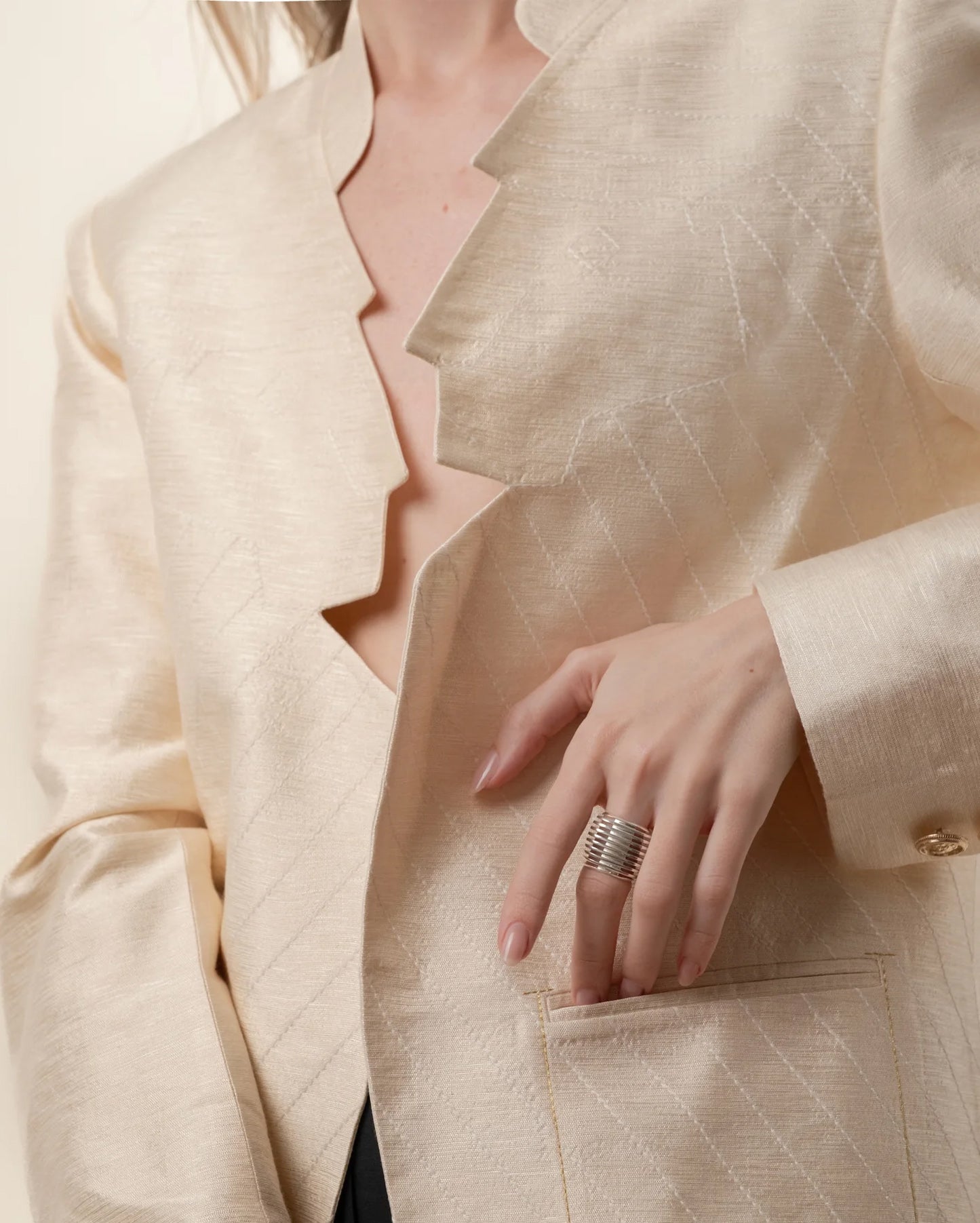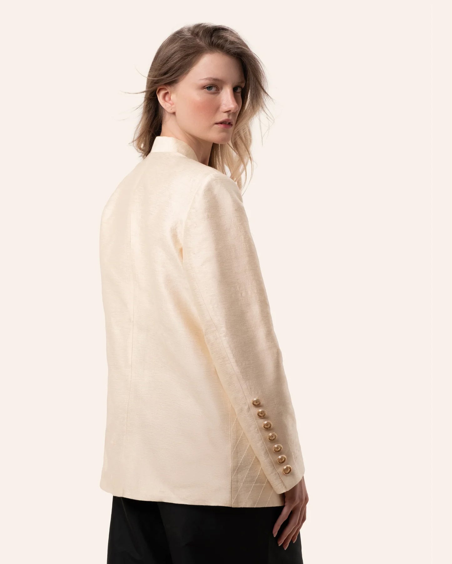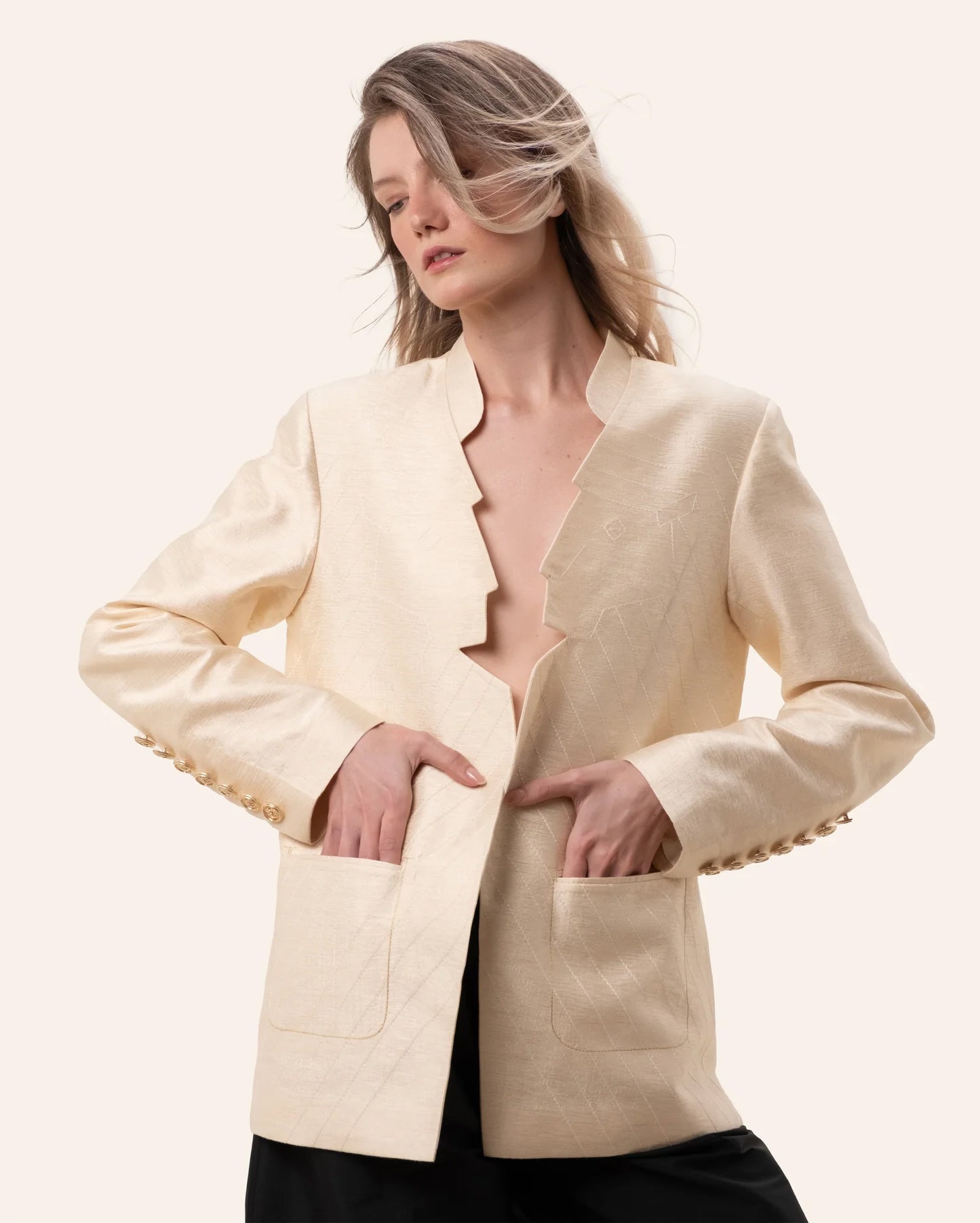 A tailored cream silk coat with a clean, elegant silhouette. Designed with a subtle lion-inspired cut at the neckline, soft quilting details, and classic front pockets. Finished with gold-tone buttons at the cuffs for a refined touch. Timeless, polished, and easy to dress up or down.
