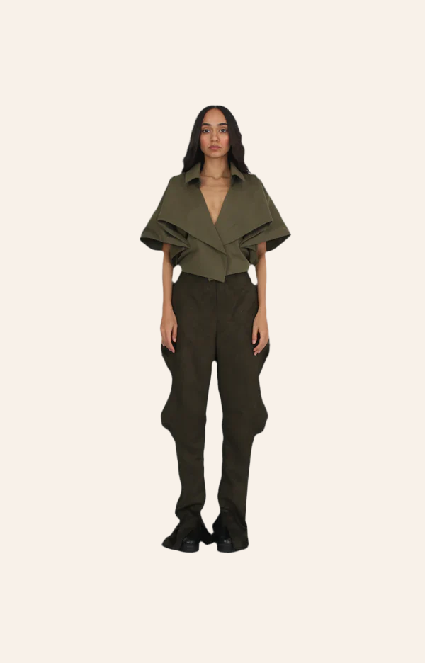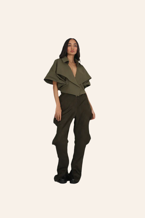 This sculptural cropped coat is defined by its folded neckline and voluminous sleeves. The structured fabric holds its shape, creating architectural proportions that frame the shoulders and chest. The open front design allows layering or can be worn alone as a statement piece.