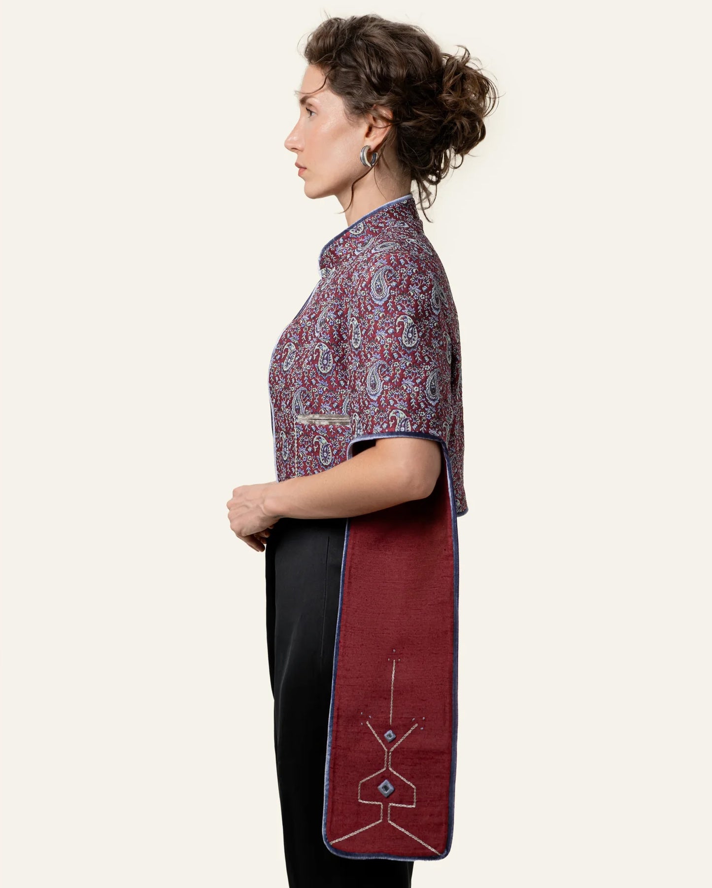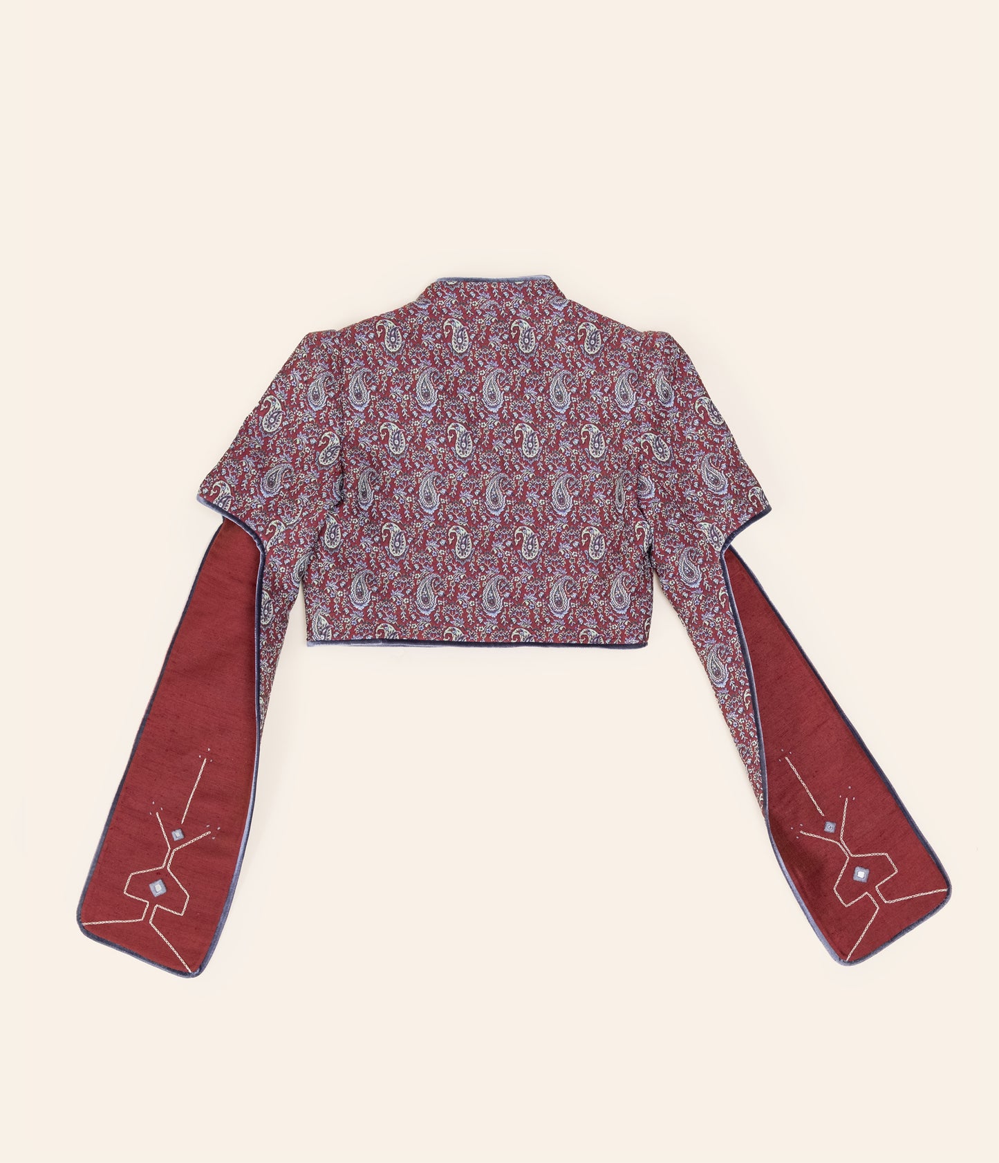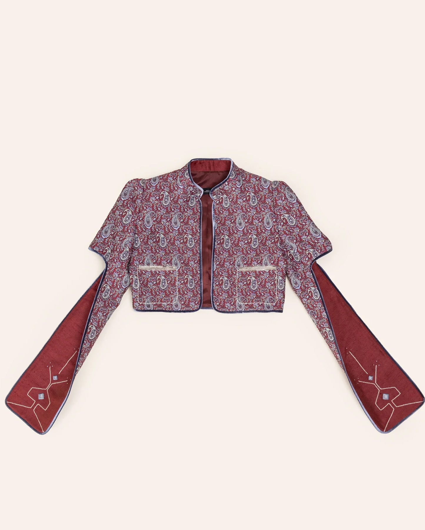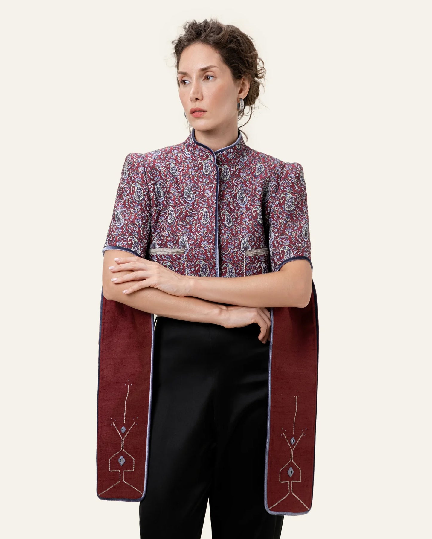 A cropped coat with a strong, clean shape. Designed with structured shoulders and open, flowing sleeves that add movement. The rich paisley fabric is finished with simple piping and subtle embroidery on the sleeve panels. Bold but easy to wear, this piece adds character without feeling heavy.