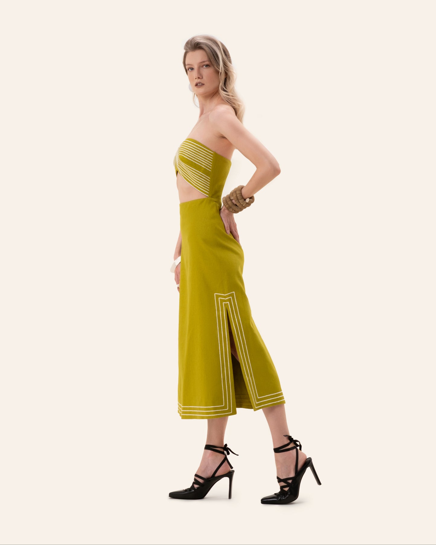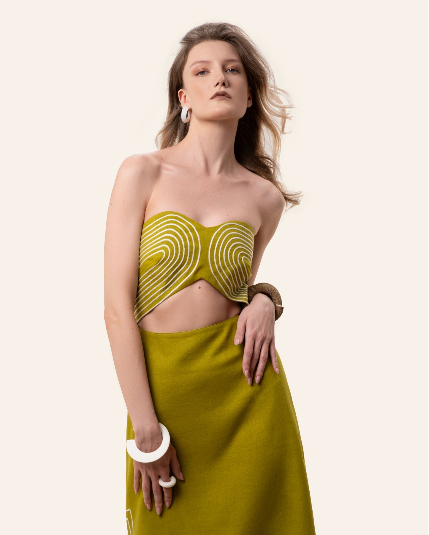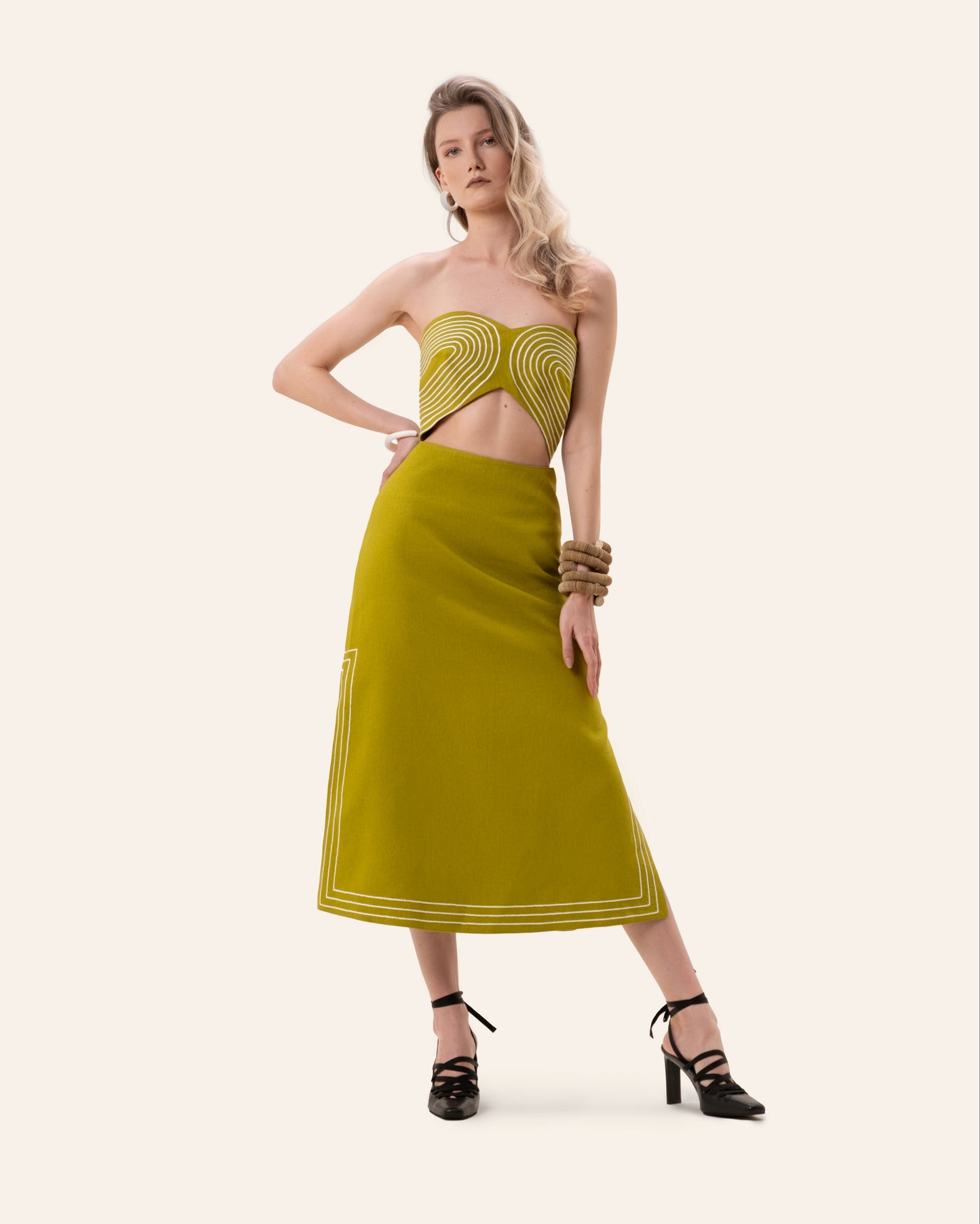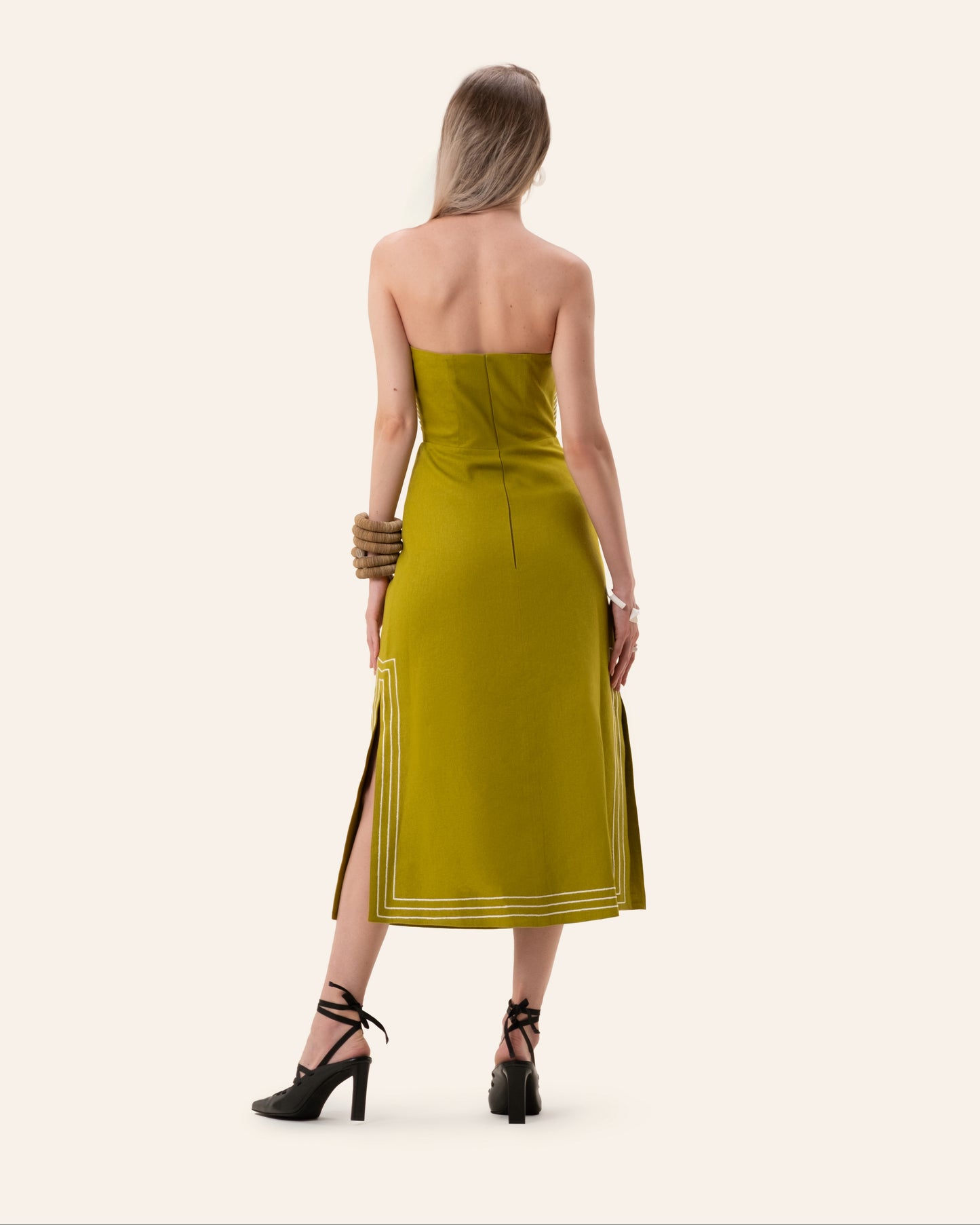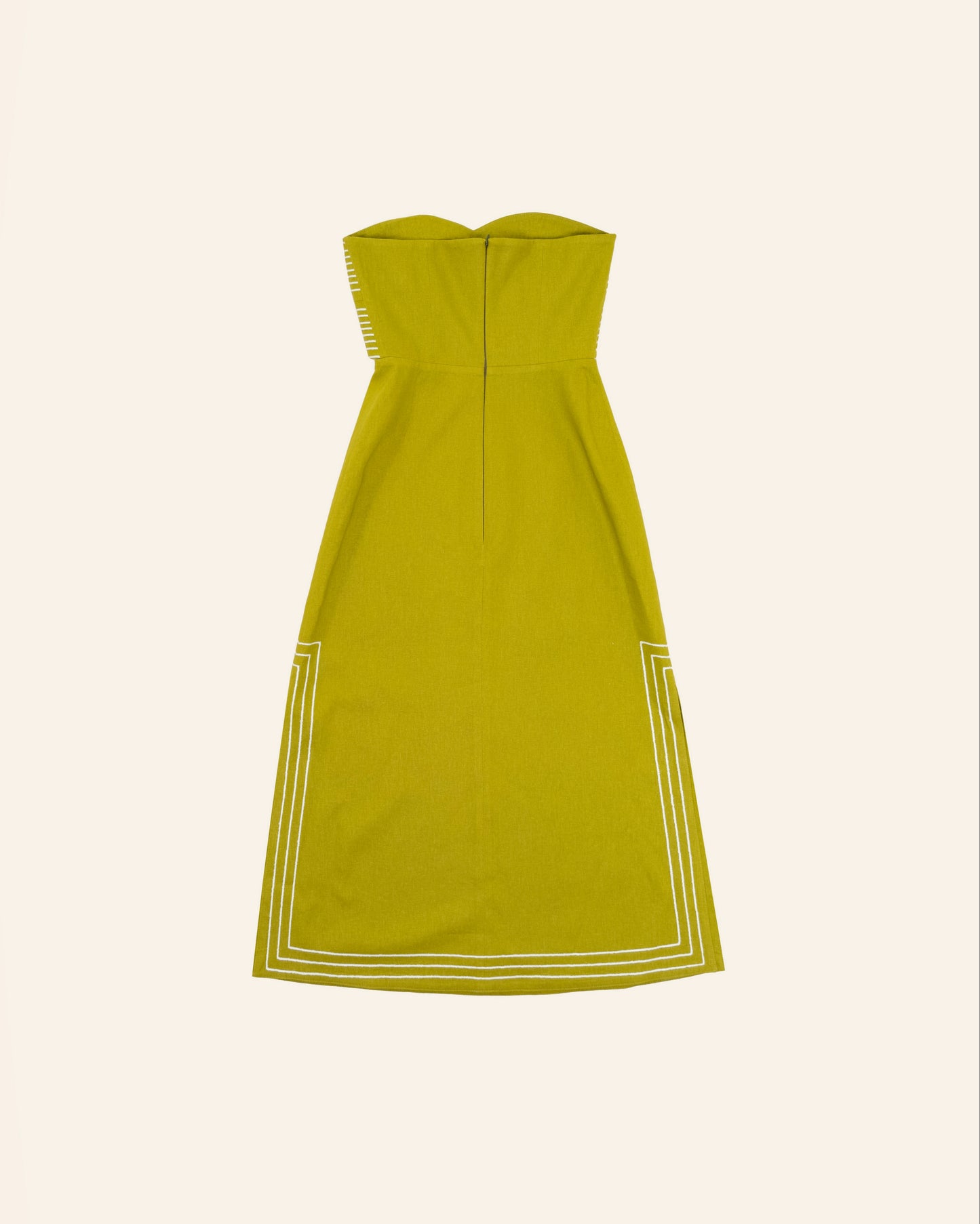 Strapless, sculpted, and unapologetic. The curved stitching and side slits do the talking—made to stand out without needing anything extra. The structured bodice holds its shape while the skirt moves clean and sharp.