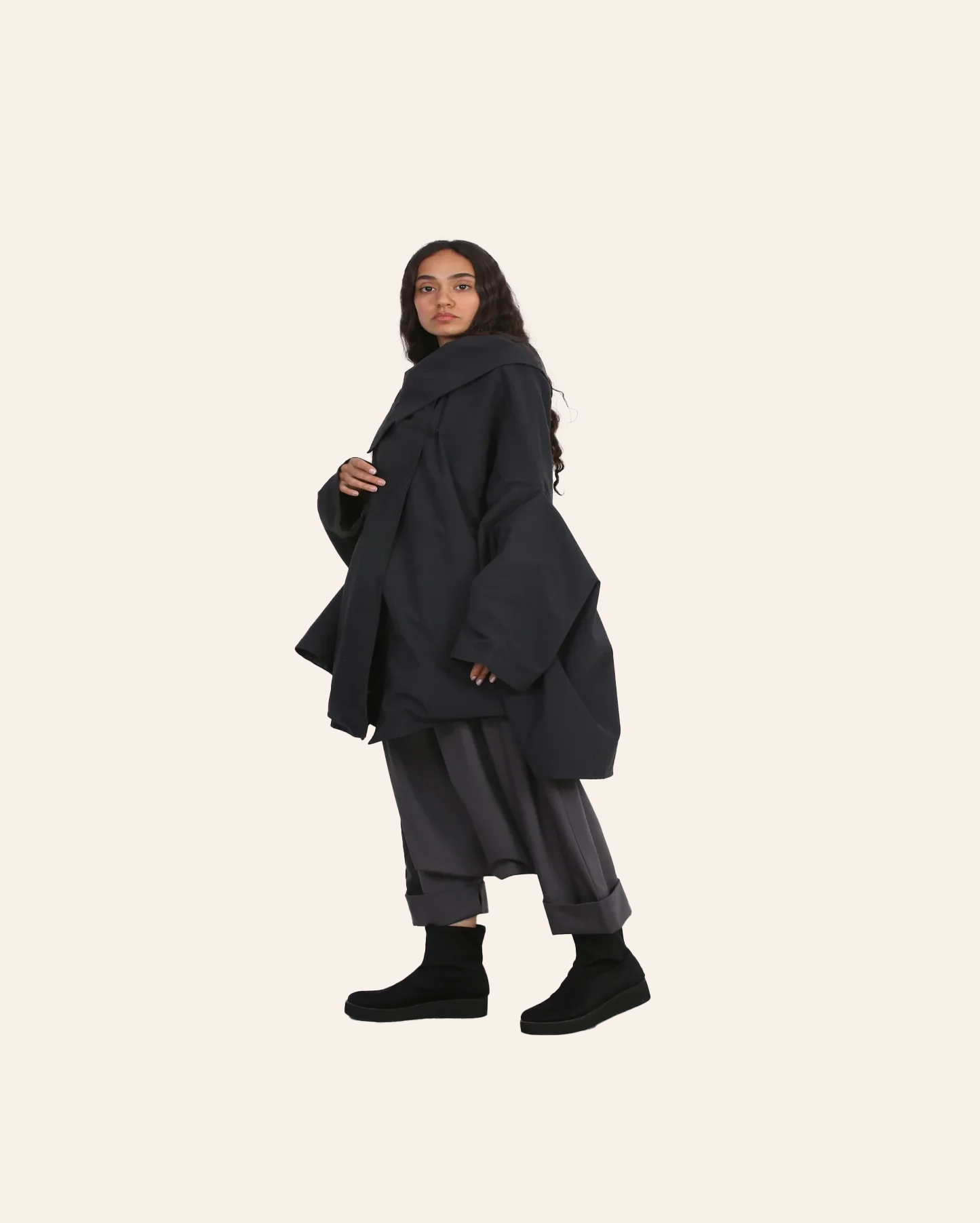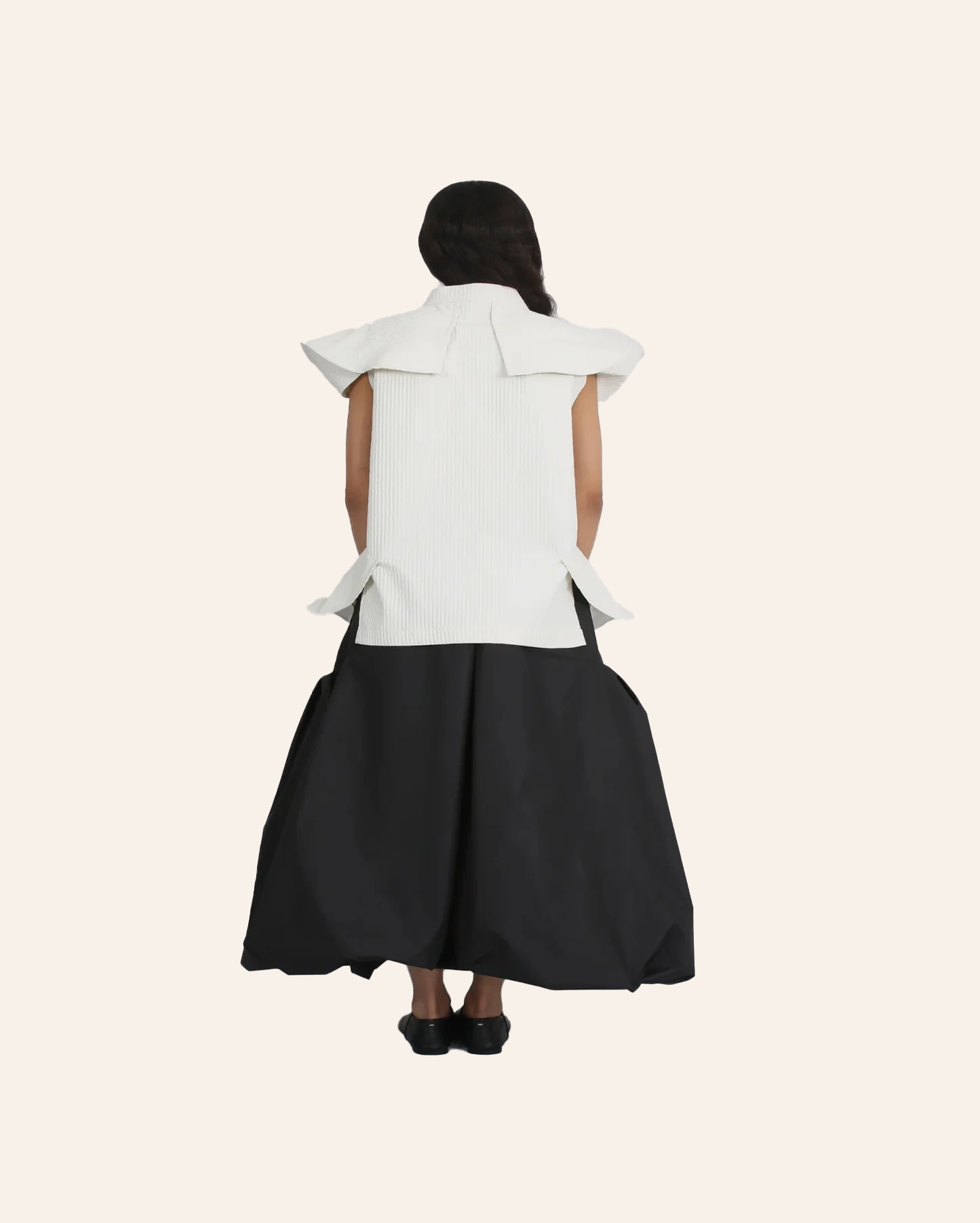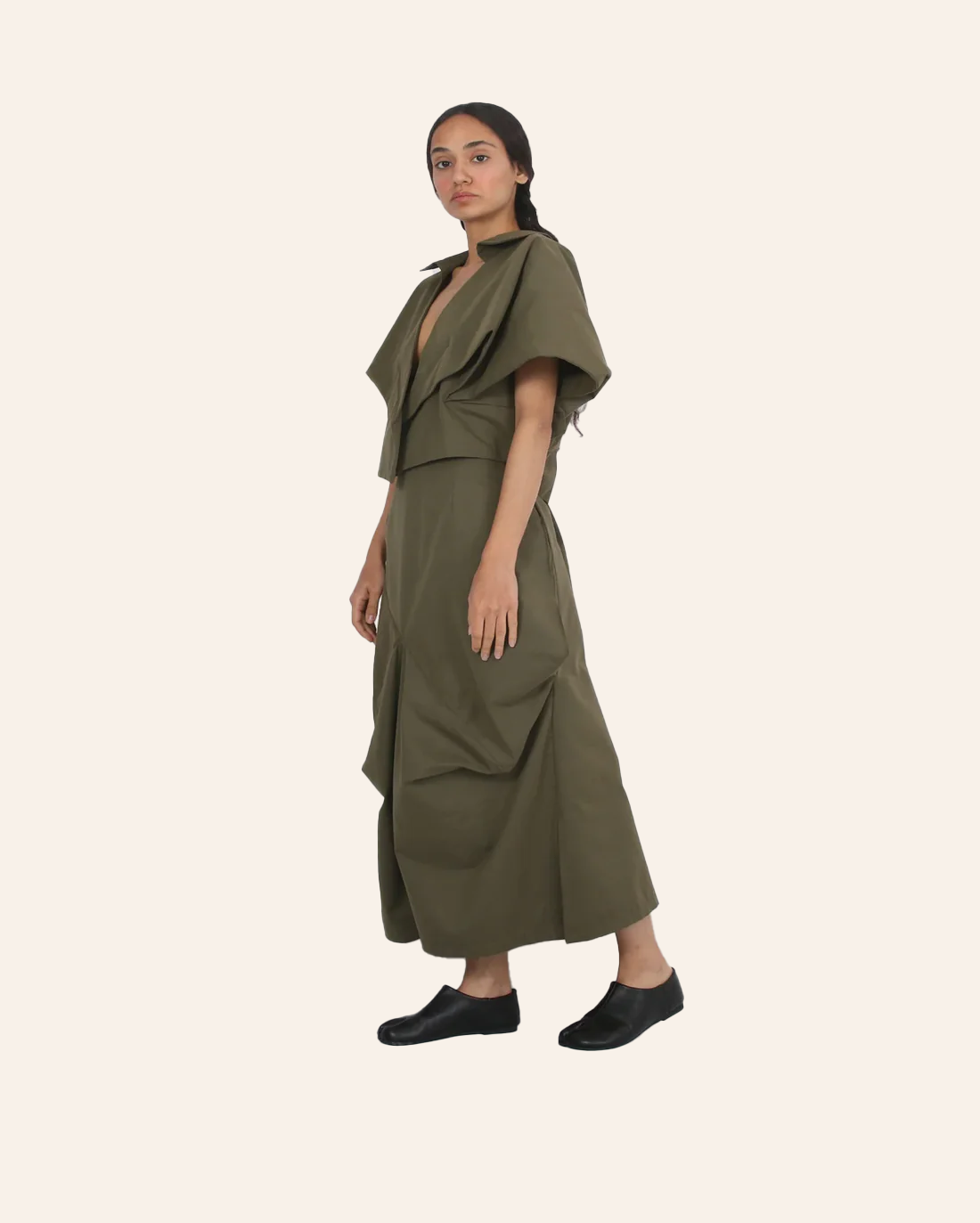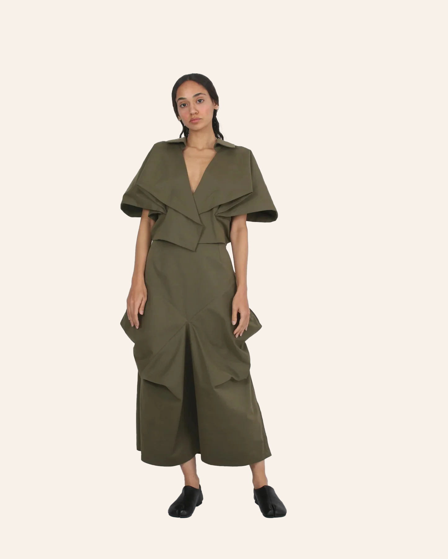 Solouk’s signature style balances minimalism with sculptural complexity. Through asymmetrical silhouettes, fluid drapery, and intricate structures, the pieces move beyond traditional fashion, offering forms that evoke both strength and softness, seeking unity within contrast, and carrying a timeless presence that transcends trends.