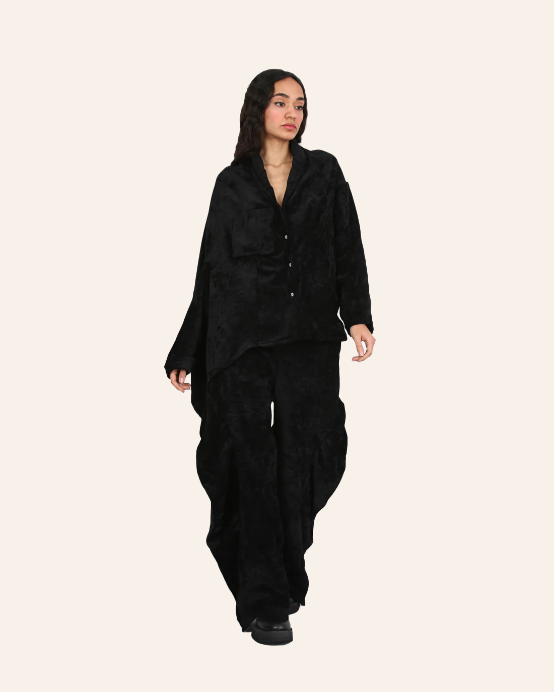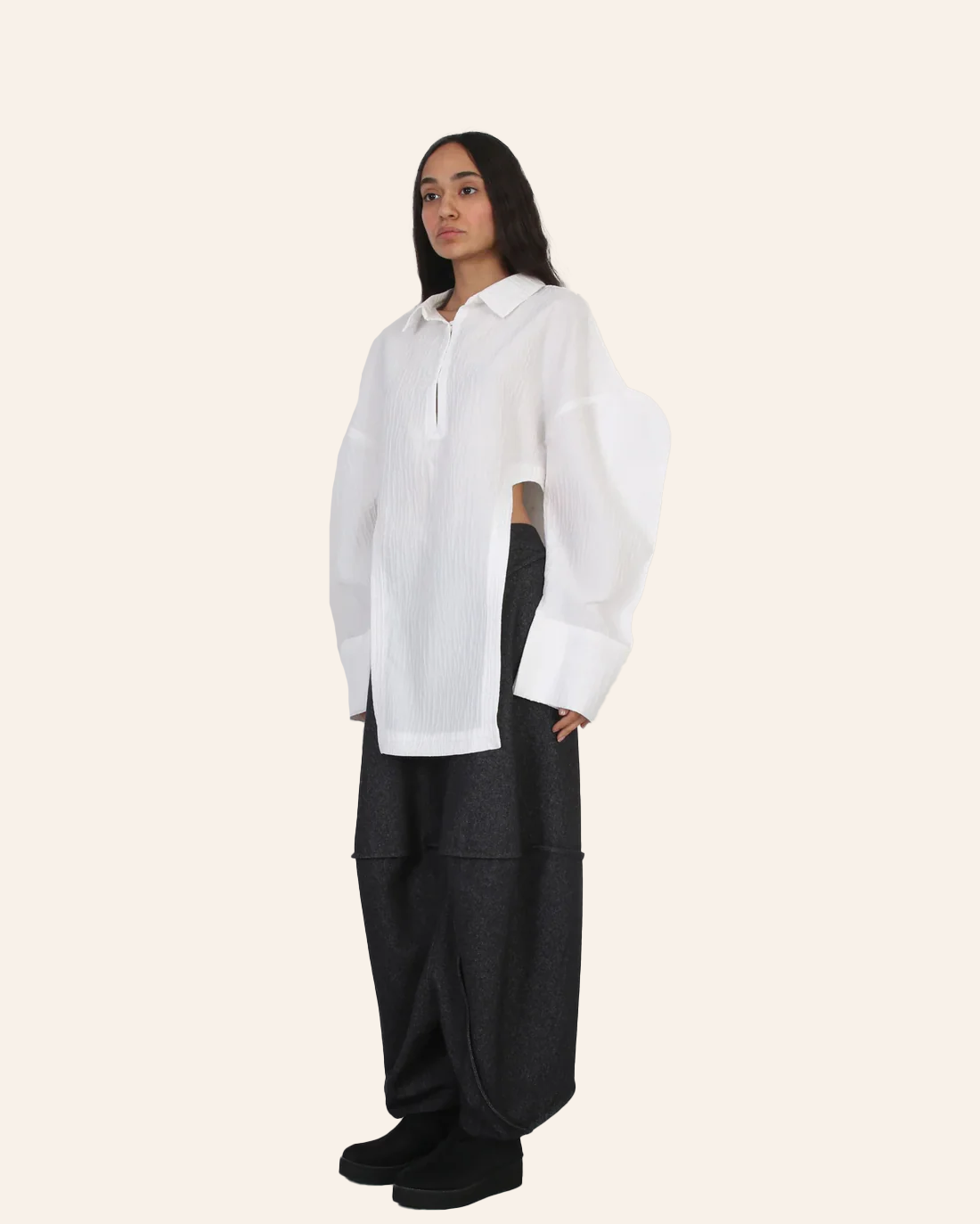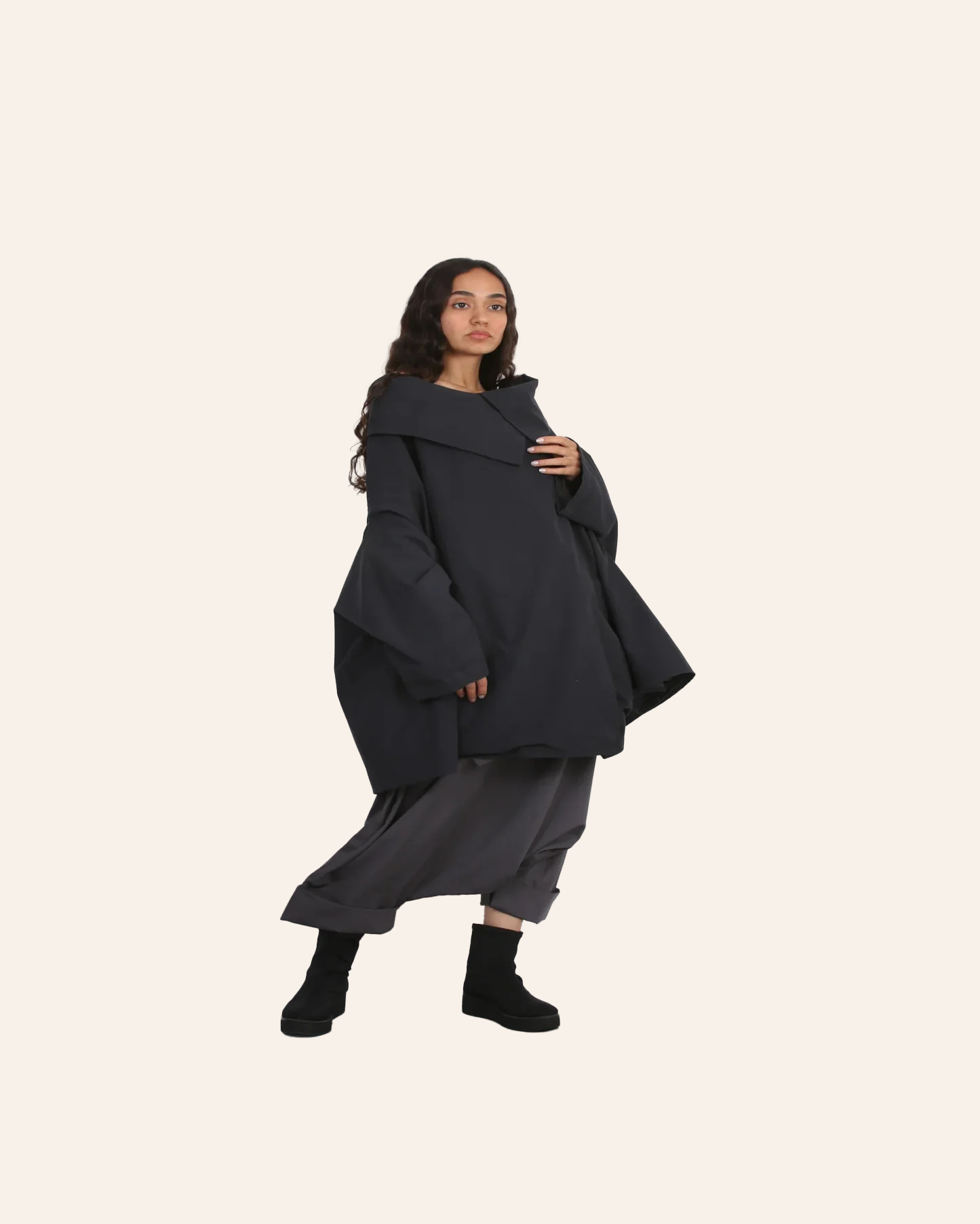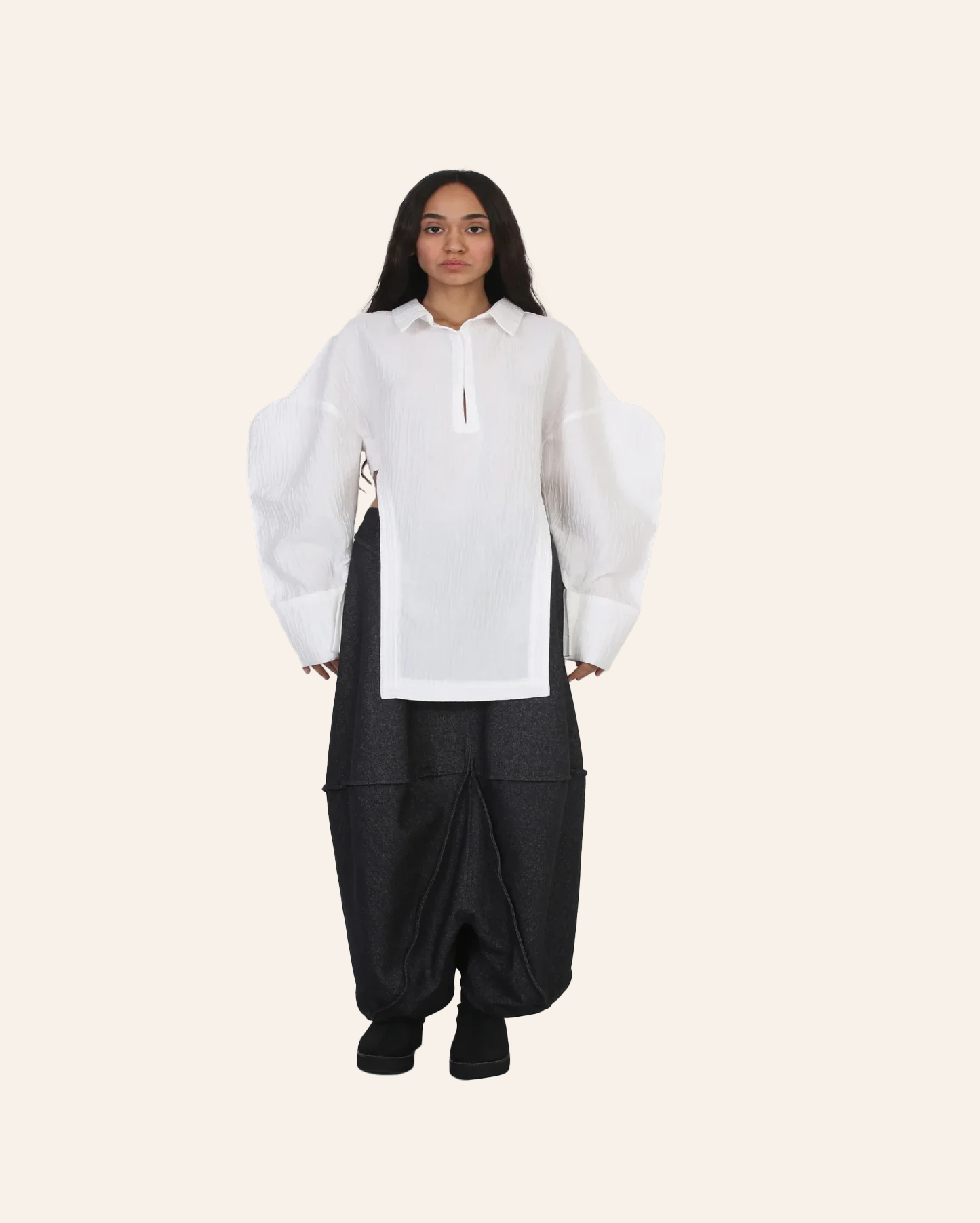 Solouk’s signature style balances minimalism with sculptural complexity. Through asymmetrical silhouettes, fluid drapery, and intricate structures, the pieces move beyond traditional fashion, offering forms that evoke both strength and softness, seeking unity within contrast, and carrying a timeless presence that transcends trends.