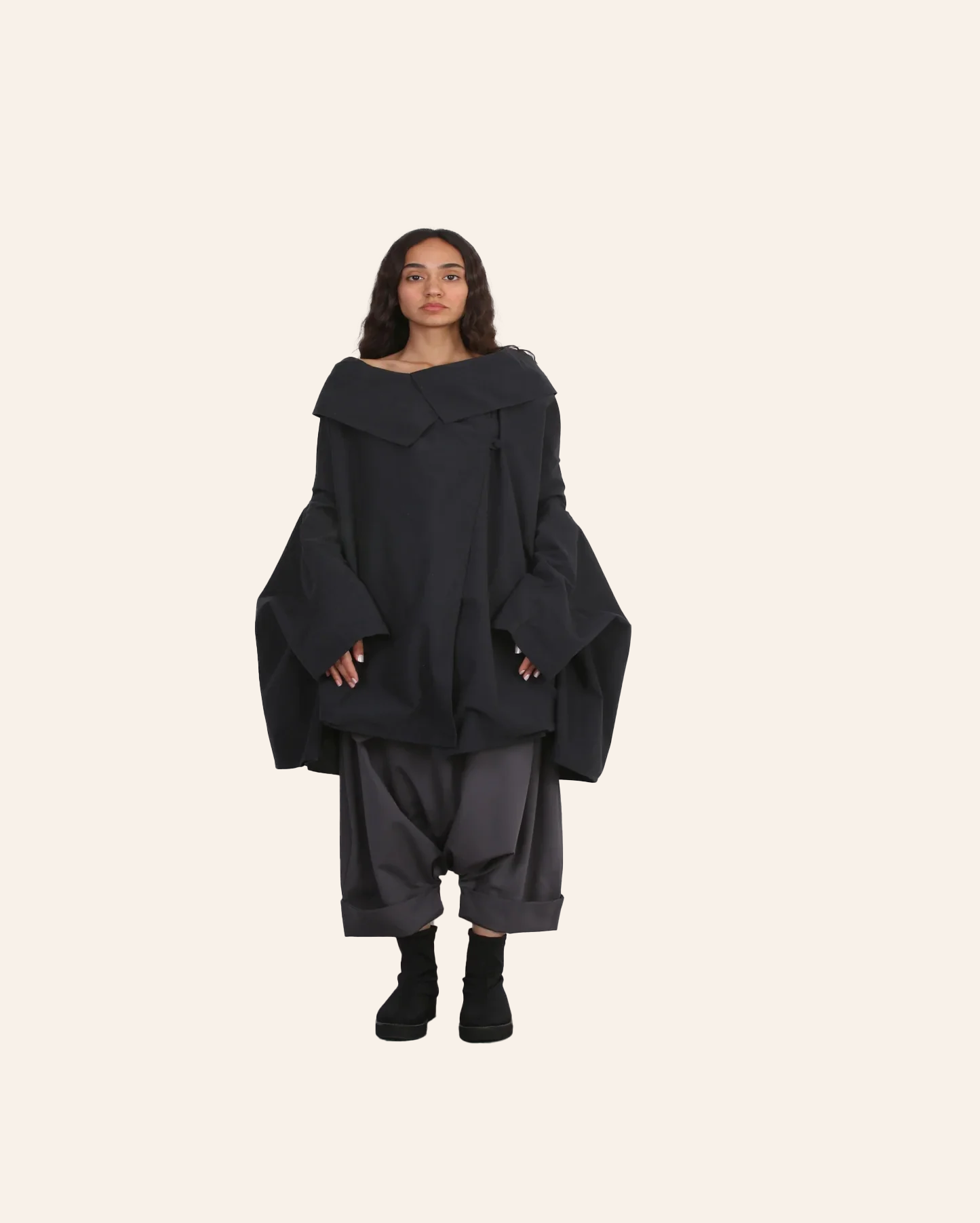 An oversized waterproof coat designed with wide sculptural sleeves and a generous silhouette that offers both protection and presence. The high structured collar folds softly around the neckline, creating a sense of shelter and strength. this piece merges functionality with architectural form, embodying Solouk’s vision of timeless design that transcends weather and trend.