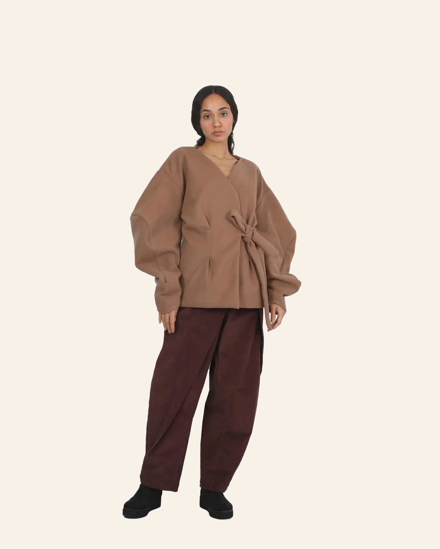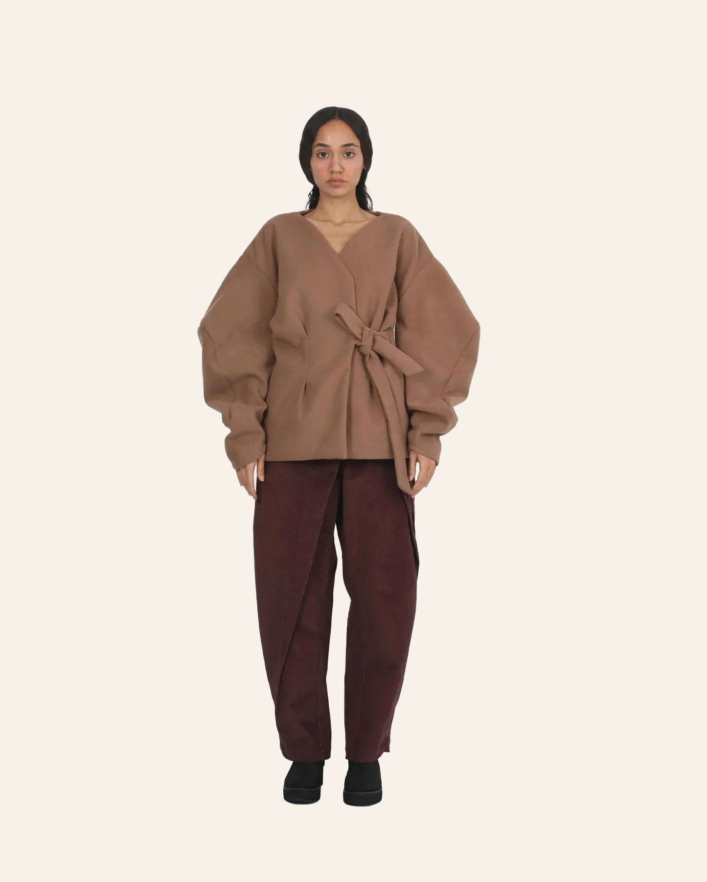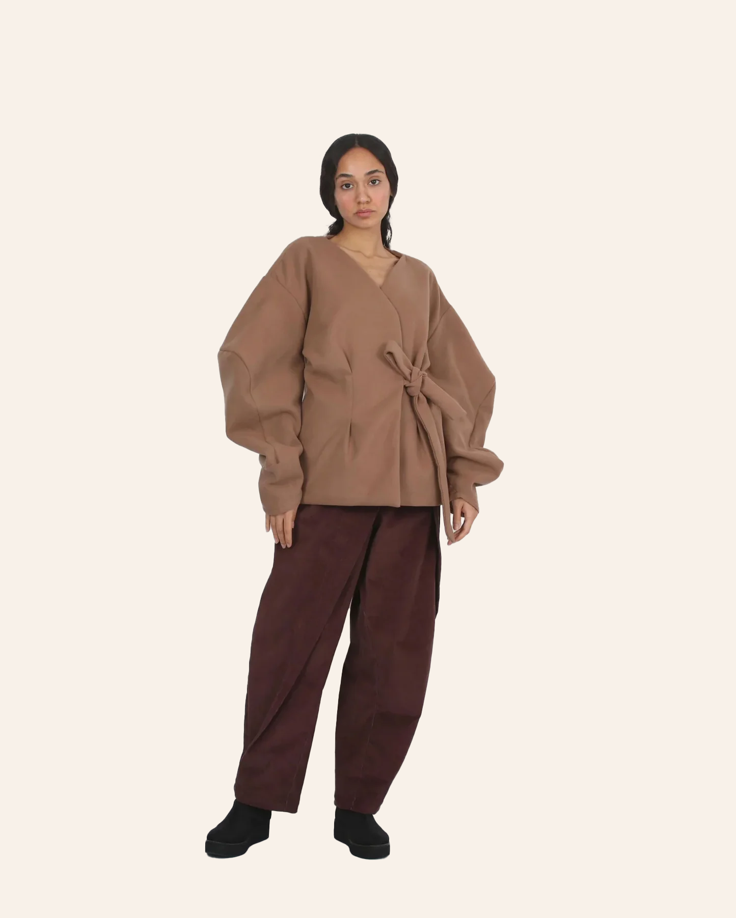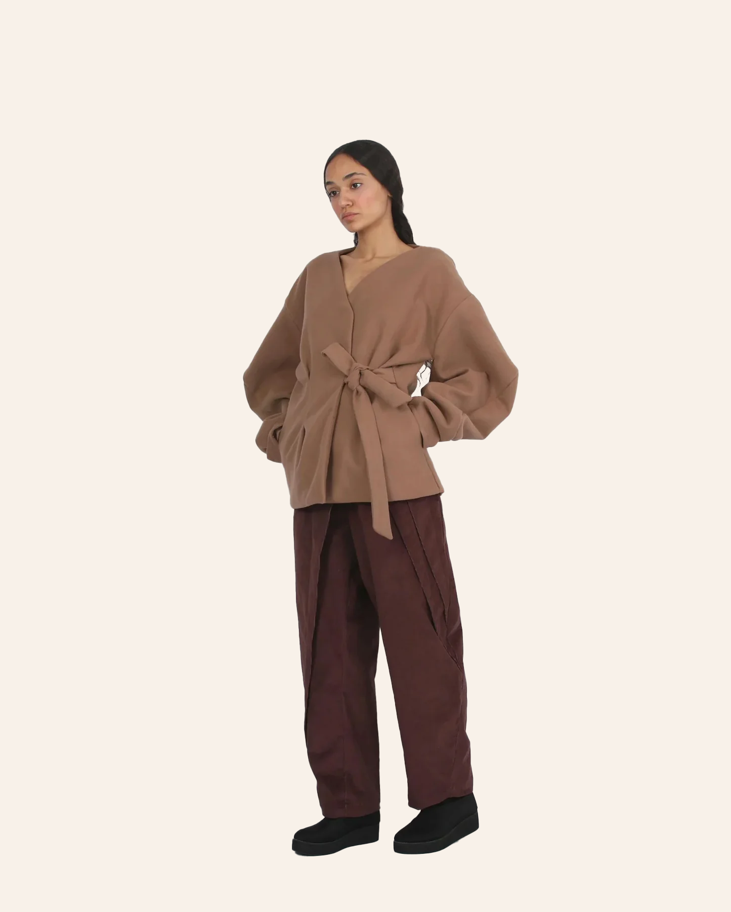 Structured yet fluid - the Terra trouser drapes with quiet movement, forming soft architectural lines that shift with the body. Designed in a warm neutral tone, it evokes a sense of grounded flow and timeless ease.